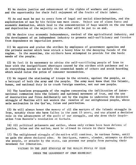 مسلمانیم نه به این معنی که یگانه وظیفه خود را روزه و نماز بدانیم. بلکه ورود ما به سیاست و فعالیت اجتماعی من‌باب وظیفه ملی و فریضه دینی بوده دین را از سیاست جدا نمی‌دانیم و خدمت به خلق و اداره امور ملت را عبادت می‌شماریم. آزادی را به عنوان موهبت اولیه الهی و کسب و حفظ آن را از سنن اسلامی و امتیازات تشیع می‌شناسیم. مسلمانیم باین معنی که به اصول عدالت و مساوات و صمیمیت و سایر وظایف اجتماعی و انسانی قبل از آنکه انقلاب کبیر فرانسه و منشور ملل متحد اعلام نماید معتقد بوده‌ایم…