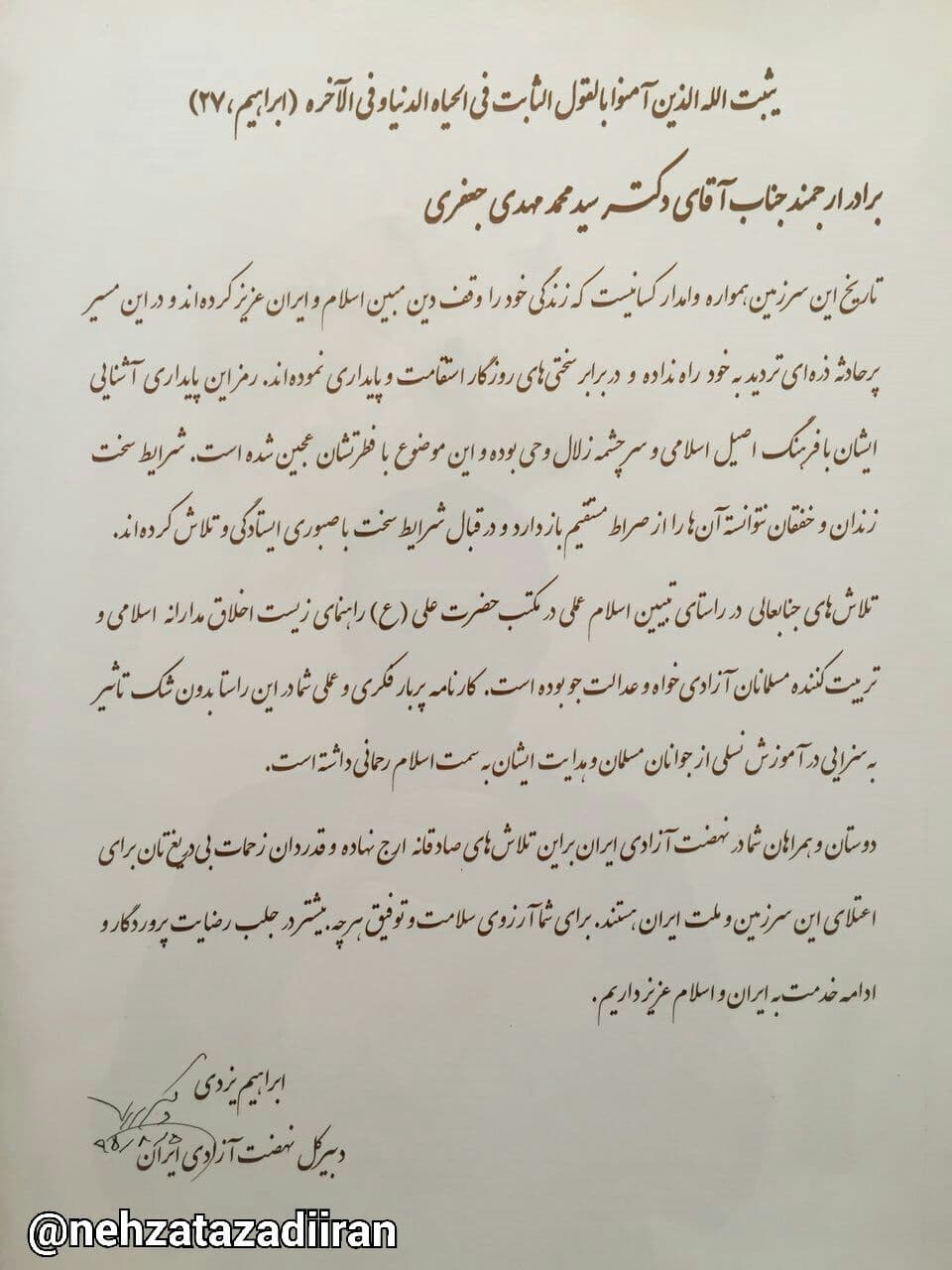دوستان و همراهان شما در نهضت آزادی ایران بر این تلاشهای صادقانه ارج نهاده و قدردان زحمات بیدریغتان برای اعتلای این سرزمین و ملت ایران هستند. برای شما آرزوی سلامت و توفیق هرچه بیشتر در جلب رضایت پروردگار و ادامۀ خدمت به ایران و اسلام عزیز داریم.