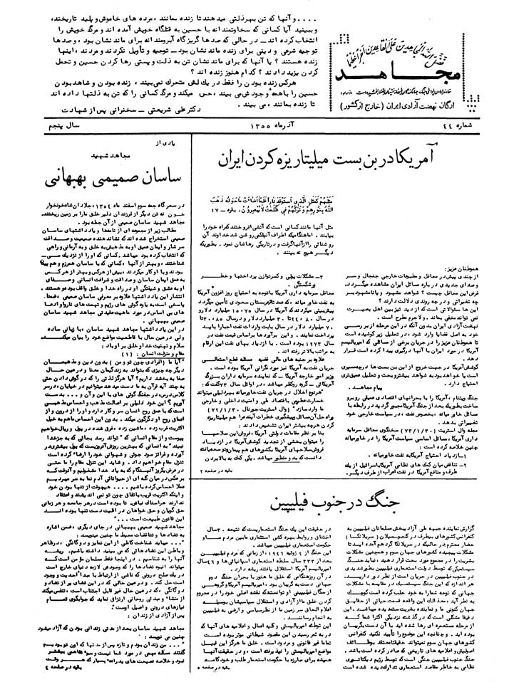 · درگيري انقلابي: اواخر مهرماه جاري جنوب شهر تهران شاهد درگيري انقلابي انقلابيون و قواي دولت بود. در اين درگيري كه مسلما انقلابيون ضرباتي بهقواي دشمن وارد آوردند خود گويا مورد حمله دشمن واقع شدند. بهموجب ادعاي دولت انقلابيون سيمين تاجحريري و اكرم صادقبيدكلاري در اين حادثه شهيد شدند و گويا دو نفر ديگر از اين گروه دستگير شدهاند كه مشخصات آنها افشاء نشده است.